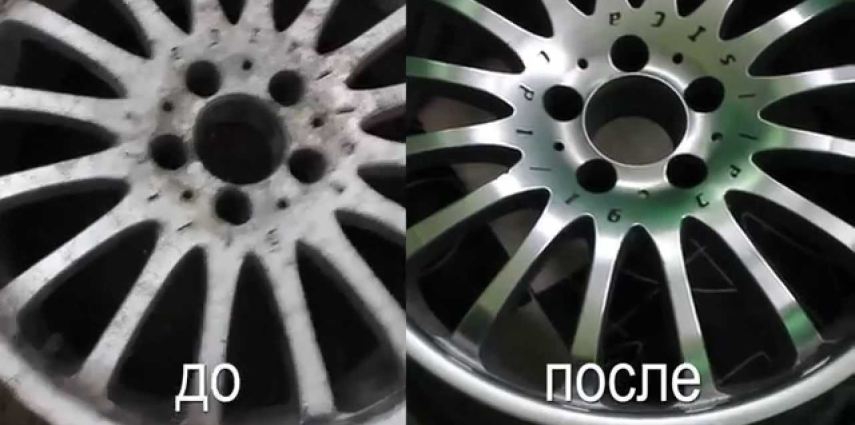 Независимо от того, насколько сильно повреждено заводское лакокрасочное покрытие на колесе, перед полировкой его необходимо удалить полностью. Для этого используется специальная жидкость для снятия лака. После этого изделие тщательно очищают от загрязнений, так как даже маленькая песчинка, оказавшаяся в зоне полировки, может повредить поверхность.
