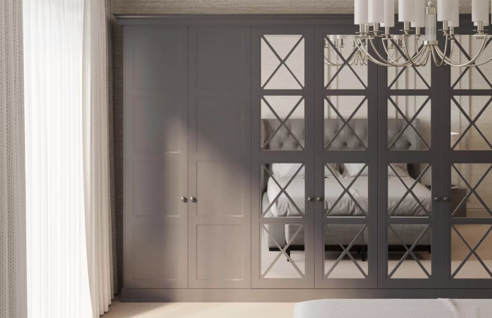 Одни из самых эффективных способов – выбрать модель с зеркальными фасадами. Они смотрятся более легко, в отличие от глухих деревянных дверей, за счет отражающей способности оптически увеличивают пространство. Такое решение проще всего реализовать со шкафом-купе. Распашные аналоги из складов магазинов редко оснащаются зеркалами во весь фасад. Так что, если нужен именно распашной шифоньер в таком дизайне, его может прийтись заказывать индивидуально.