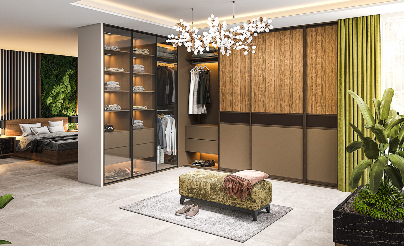 Шкаф для вещей необязательно должен быть полностью однотонным. Можно подобрать интересный, но ненавязчивый, декор, который будет вторить оформлению комнаты. Способствуют гармонизации вертикальные линии и узоры в дизайне. Они должны быть пропорциональными обстановке. Линии и орнаменты должны быть соразмерными габаритам комнаты. Стоит избегать горизонтального деления широкими полосами, крупных контрастных вставок, массивных ручек – все эти детали не только утратили актуальность, но и дополнительно «нагружают» интерьер.
