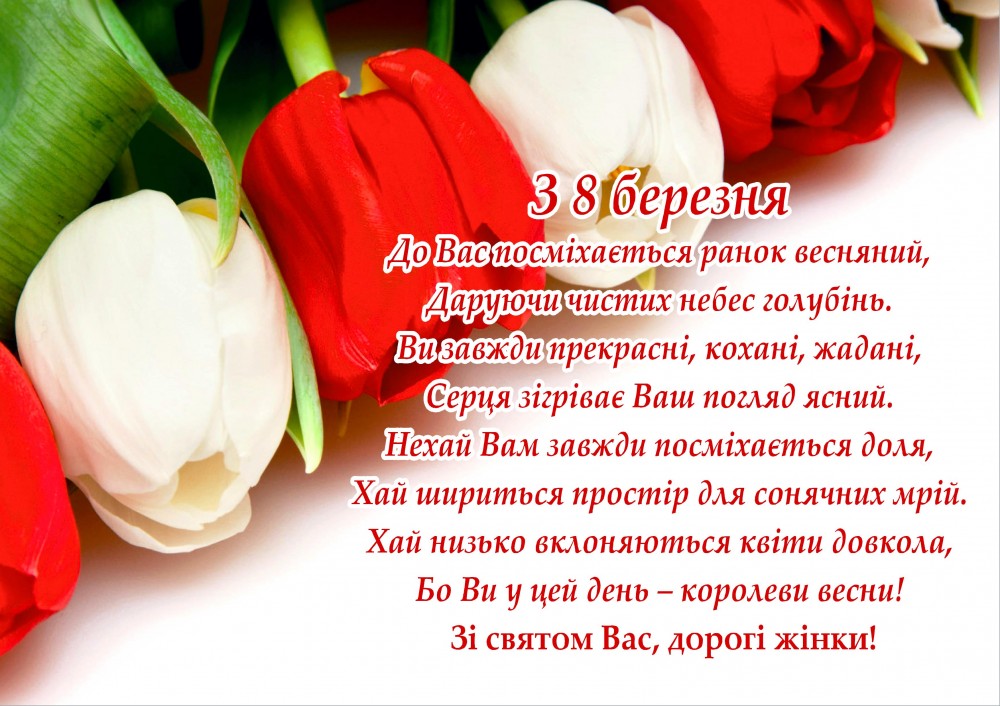 Дорогі наші жінки, найпривабливіші і найдобріші! Любі наші дружини, дочки, матері, тещі, подруги і всі-всі представниці прекрасної статі! Вітаємо вас з днем 8 березня! Бажаємо, щоб ваші серця належали тим, хто любить і обожнює вас, щоб кожен день ви відчували турботу, відданість, вірність, допомогу і підтримку! Кохайте самі і будьте завжди коханими, залишайтеся такими ж неповторними, ніжними і теплими! Щастя вам, радості й удачі завжди і в усьому