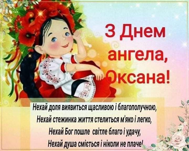 Оксана, в День твого Ангела хочеться побажати тобі, щоб твоє світле, радісне життя було наповнене любов’ю до ближніх, щастям, добробутом. Нехай близькі завжди радують, друзі будуть поруч і все в житті складається вдало.