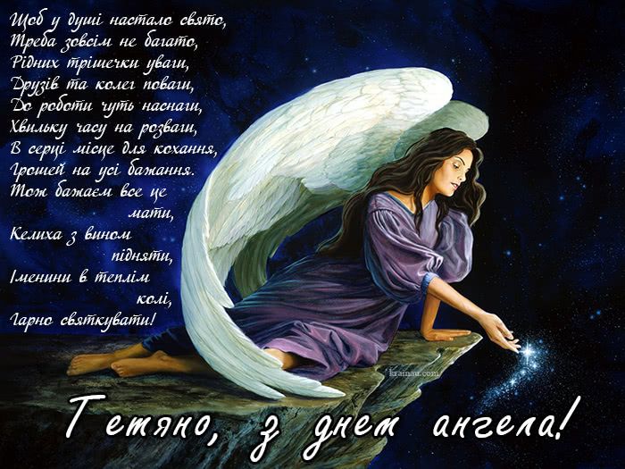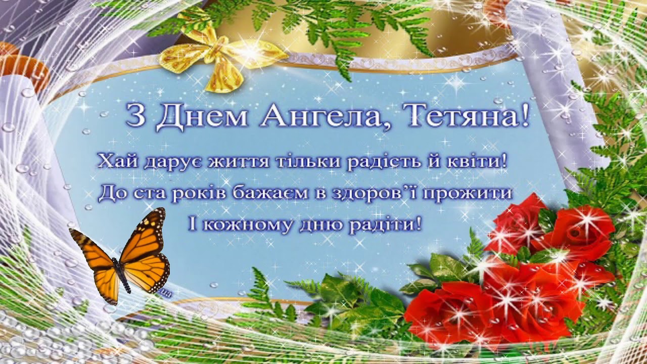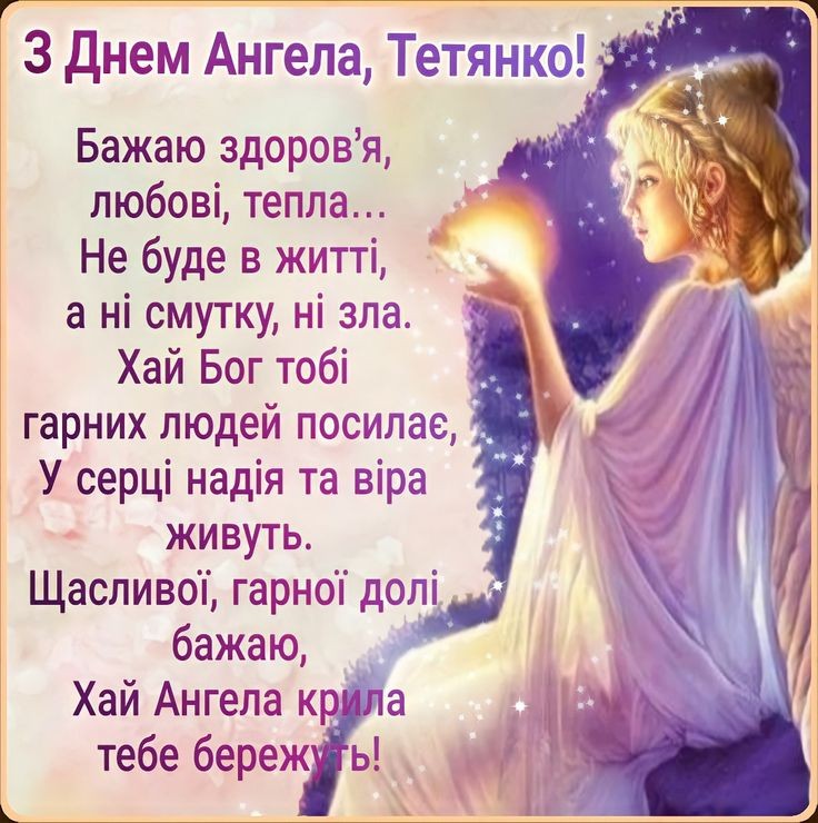 Дорога Тетяно, з іменинами тебе! У цей світлий день бажаю миру, добра, кохання, щастя, благополуччя, успіху та здоров’я. Нехай ангел-охоронець оберігає тебе від усіх негараздів, а в душі панує віра, спокій та благодать
