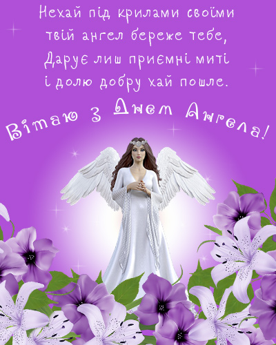 Вітаємо з Днем Ангела! Нехай твій небесний охоронець буде поруч Тебе у хвилини радості й смутку, кохання і розлучень, щохвилини, щосекунди. Коли Ти впадеш, він – підніме, коли ти заплачеш – втішить, коли ти радітимеш він разом з тобою радітиме